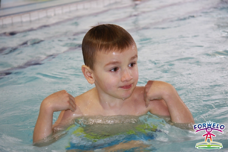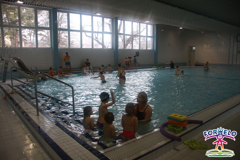 V první hodině plavání jsme se seznámili s pravidly plaveckého "mokrého" provozu.V základech plavání jsme se učili dýchat do vody, splývat, dělat hvězdičku na bříšku i na zádech. Teta Dáša nám vysvětlila důležitost palečků přes hranu bazénu při skákání a mnoho dalších krásných a užitečných dovedností. Pak nás čekalo dovádění s pomůckami, potápění a super vodní dráha, zvaná mokrá opičí, kterou jsme nechtěli za žádnou cenu opustit. Z fotek je vidno, že bazén byl školami plně obsazen, což nás potěšilo nejvíce, že jsme jako JEDINÁ SOUKROMÁ ŠKOLKA ZAJISTILA SVÝM DĚTEM PLAVECKÝ KURZ! Pak už nás čekalo sušení, fénování a hurá na oběd. I nespavci se těšili na řádný poobědový režim postýlek - a spinkání. TĚŠÍME SE ZAS A ZNOVU, JAK BUDEM PLAVAT VE FORMELU!